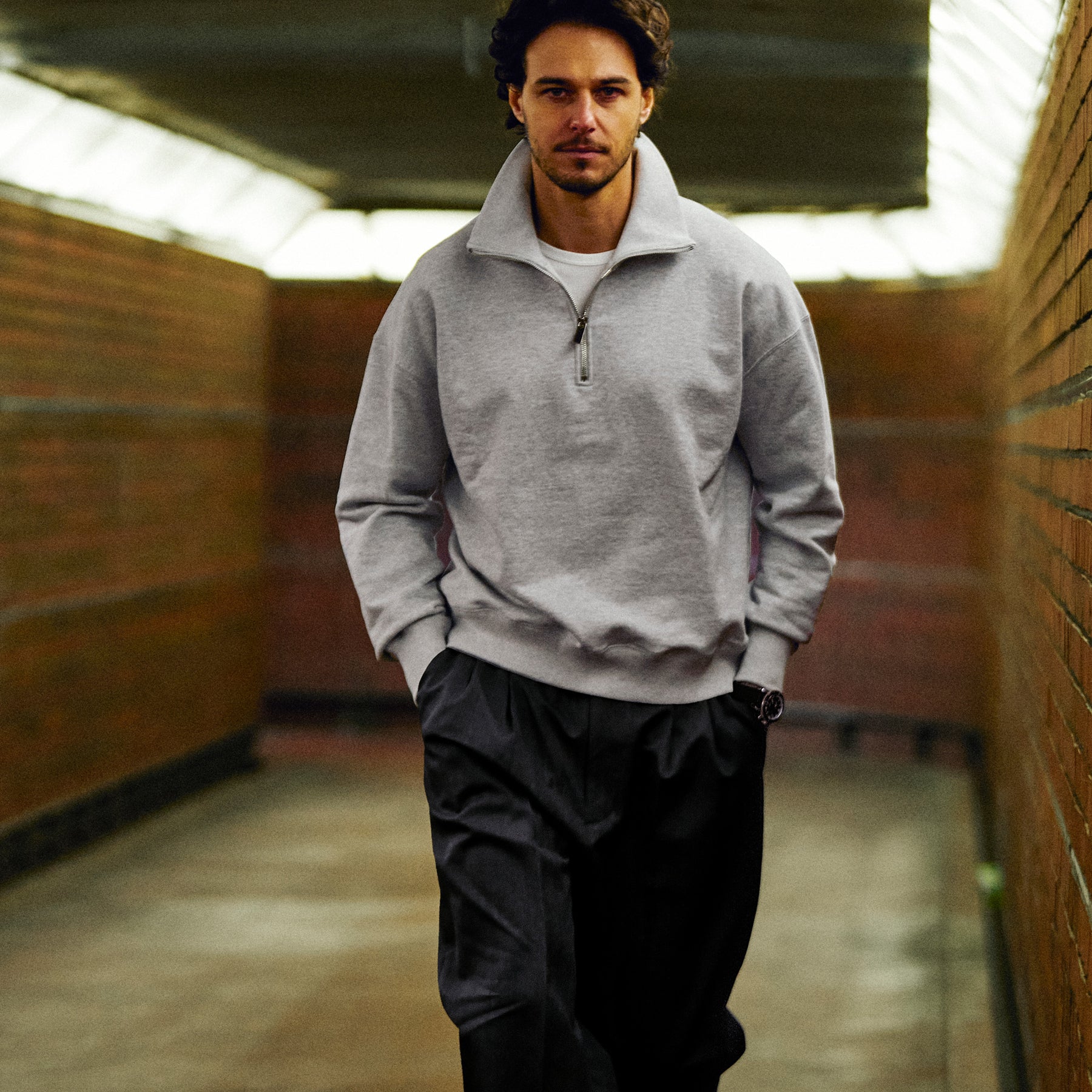 「03 HALF ZIP」は、50年代のヴィンテージ スウェットシャツにみられる着丈、身幅、肩幅がほぼ同寸のBOXシルエットを踏襲しながら、アームがもたつかないようシルエットを調整。ゆったり感がありながらも都会的なスマートさを感じる佇まいに仕上げています。