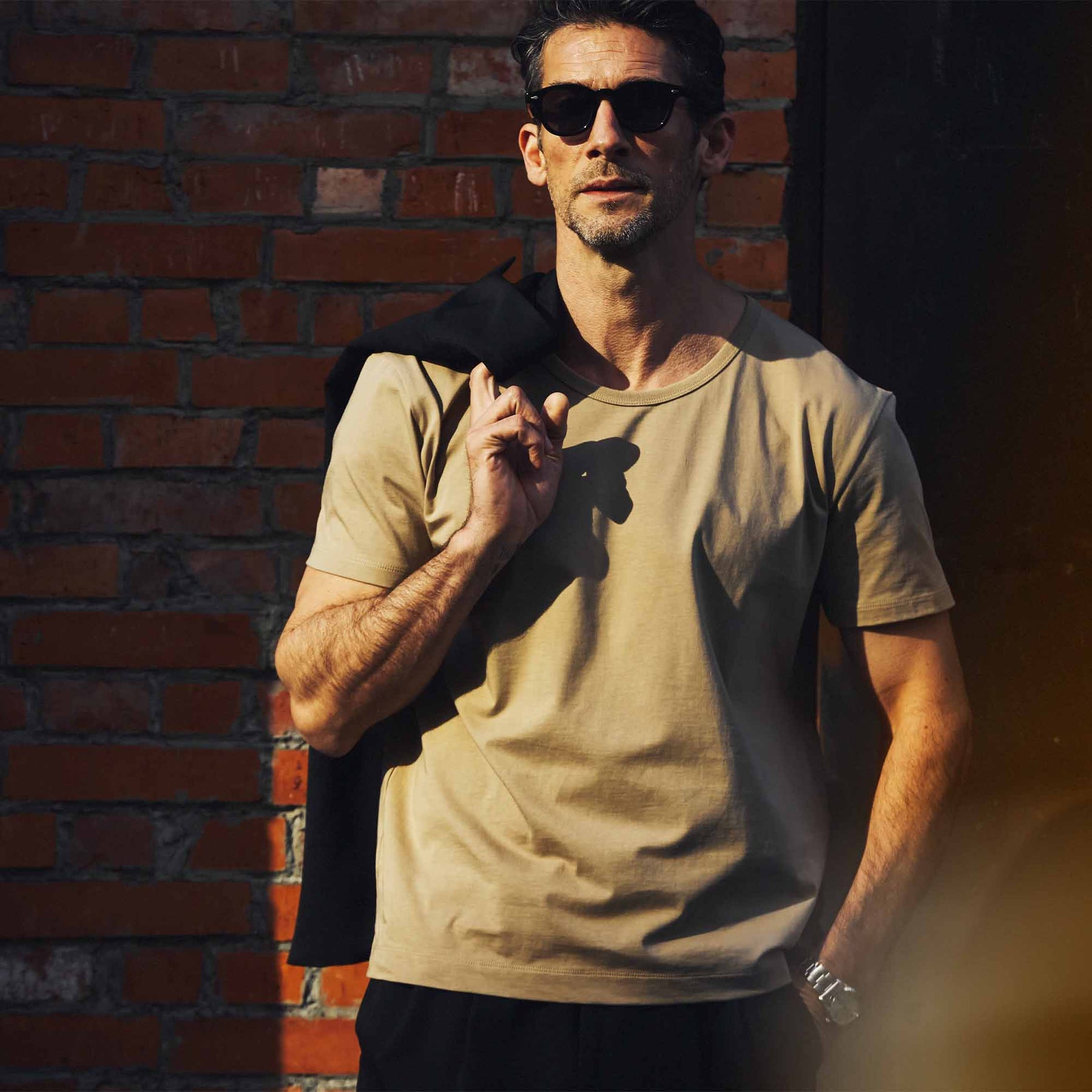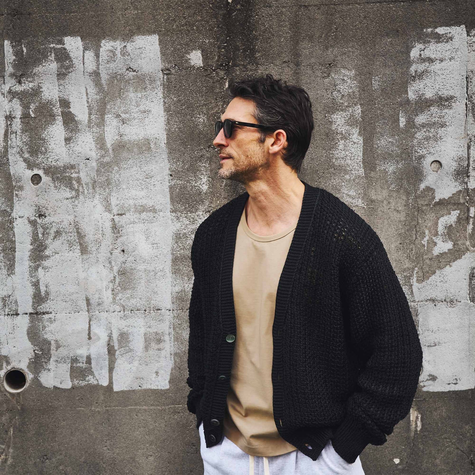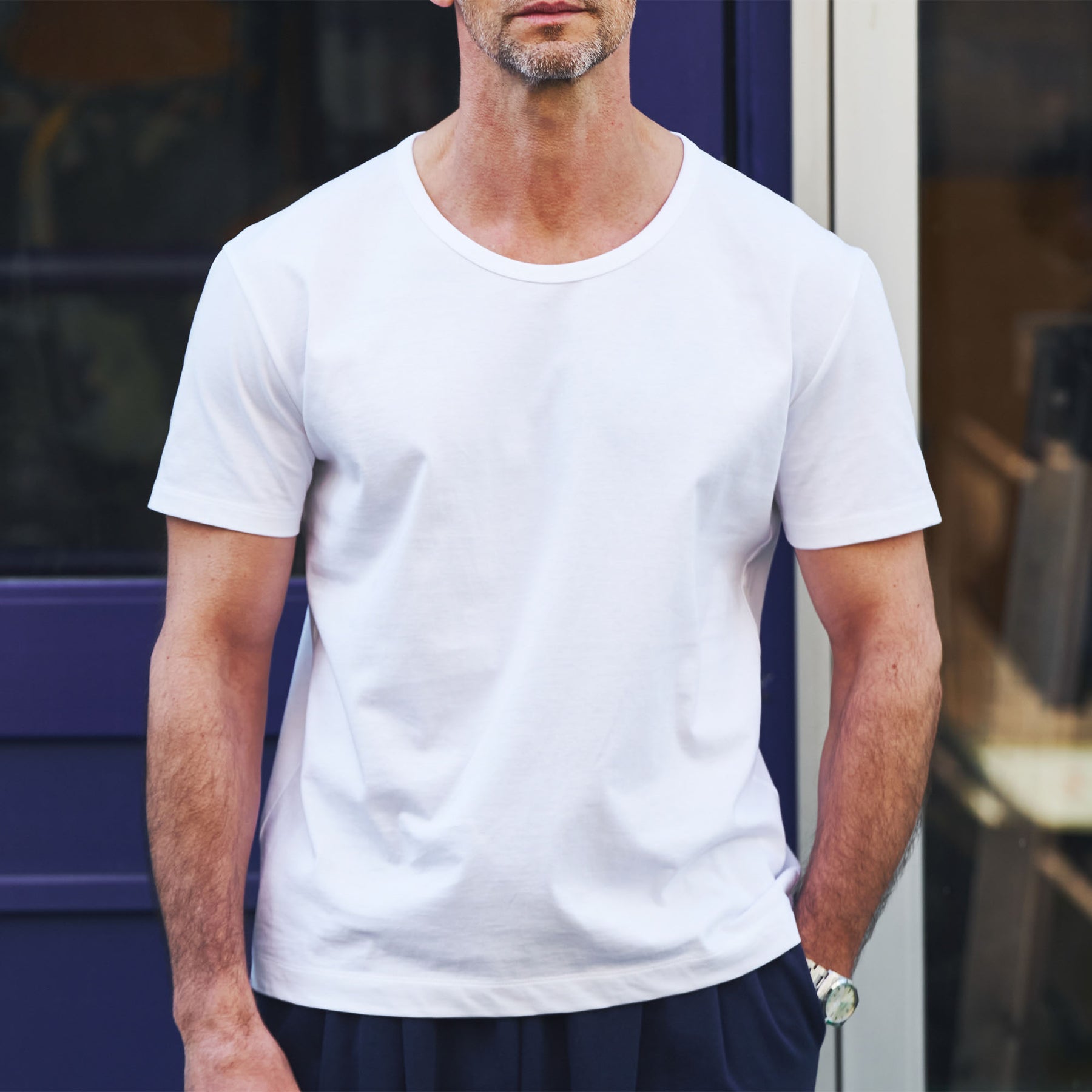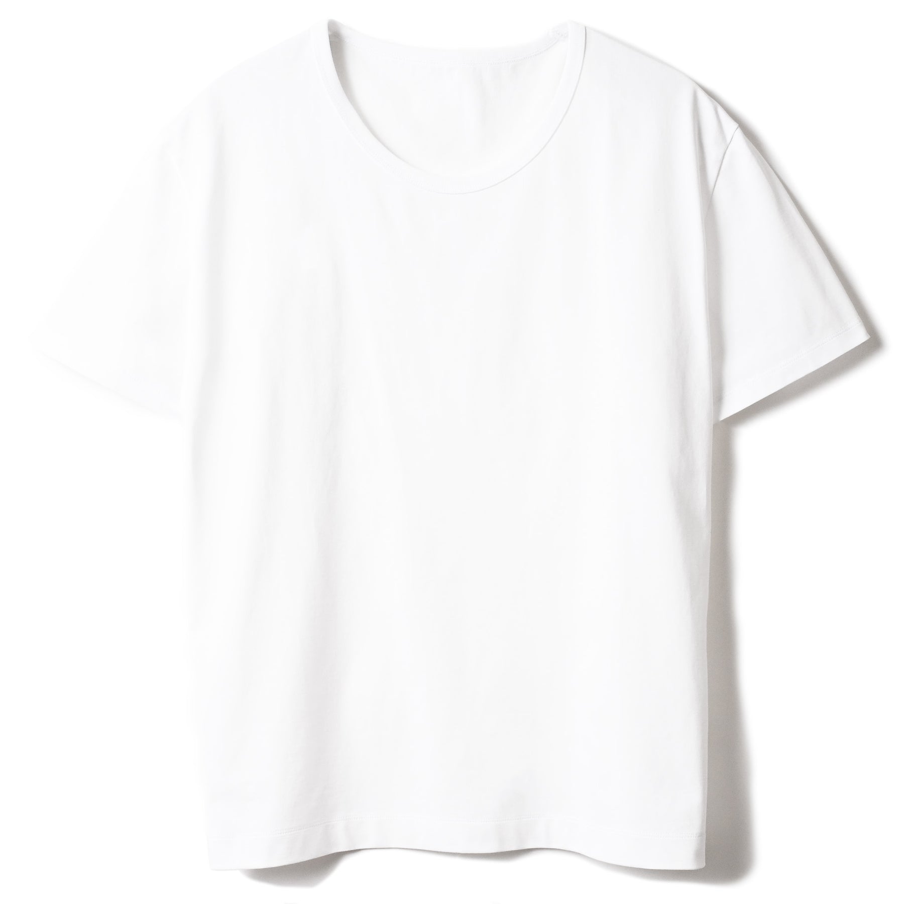 Tシャツのなかではベーシックな天竺編みですが「毛羽が少なく、なめらかな表面」「繰り返しの洗濯にも強い耐久性」「素材本来の、自然な艶」を感じられるのは、この特殊な47/2サイロの生地だからこそ。朝に迷わず手に取り、そのまま街へ出られる安心感がある。洗濯を重ねても品の良さが損なわれにくいから、気負わず着られて、気づけば着用頻度が上がっていく。自然な艶があるぶん、合わせがシンプルでもどこか整って見える。その“ちょうどよさ”こそ、この生地のいちばんの価値です。