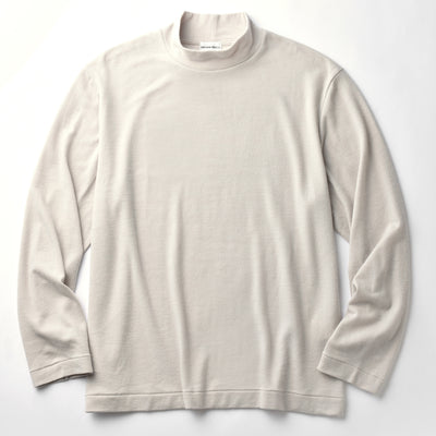 窮屈さを感じさせないように設計されたモックネックは、コーディネートを上品な印象に仕上げてくれます。袖口と裾はあえて絞らずカットソーらしい軽快な雰囲気に。ステッチはクラシックな“天地引き”を採用してレトロモダンなムードを漂わせます。